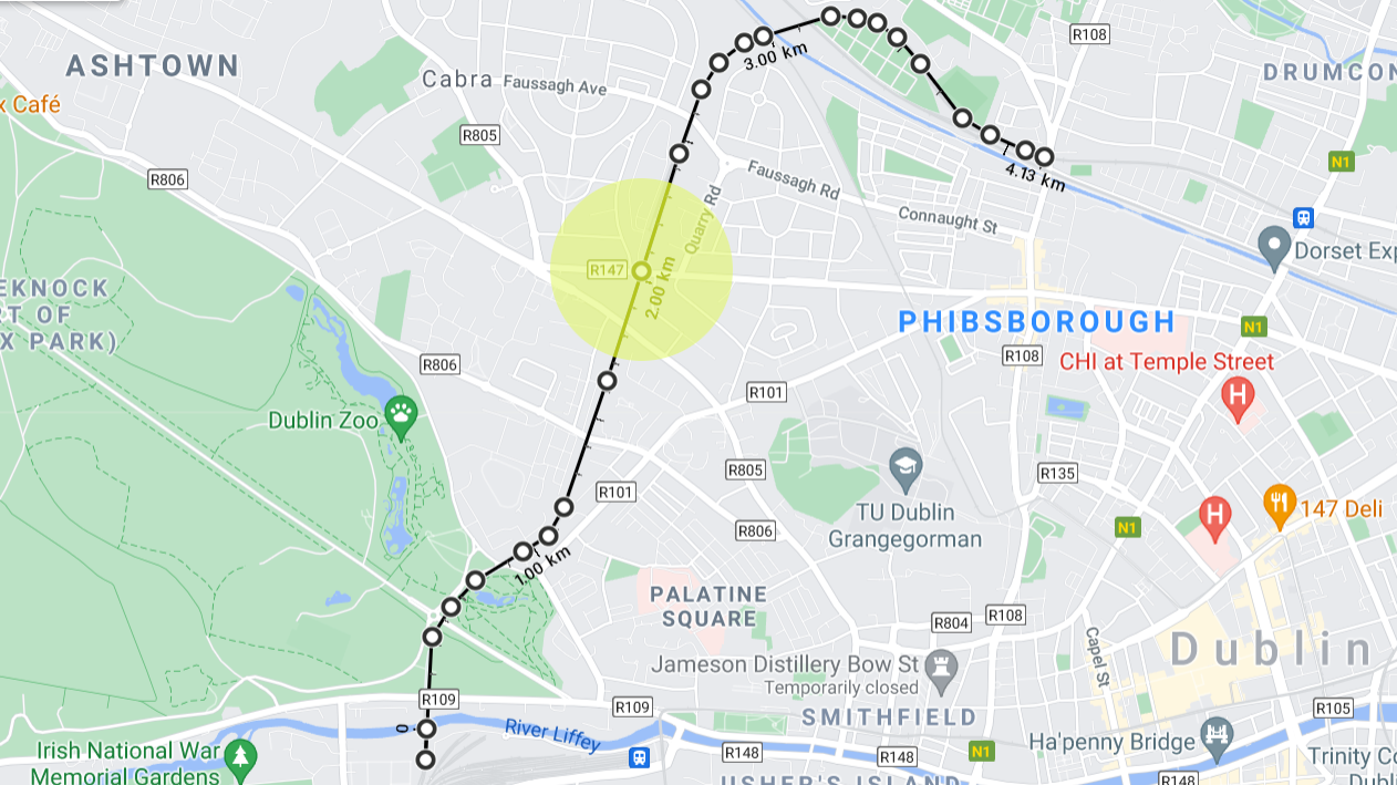 In the current emerging preferred route there is a stop in Glasnevin (at the Des Kelly/Brian Boru site) and a potential stop at Platform 10 in Hueston. That’s a stretch of roughly 4km, much of it through Cabra. But there’s currently no stop planned for Cabra.
